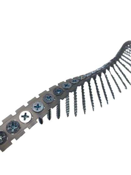 En bandad skruv är en skruv som är fäst på en remsa av material, såsom papper eller plast, för att göra det enkelt att mata in skruvarna i en skruvdragare eller automatisk skruvautomat. Bandade skruvar är ett populärt val inom byggbranschen eftersom de är enkla att använda och minskar risken för skruvförlust. Våra bandade skruvar är tillverkade av högkvalitativt material och är tillgängliga i olika storlekar och längder för att passa dina behov. De är också kompatibla med de flesta skruvdragare och skruvautomater på marknaden. Använd våra bandade skruvar för att effektivisera ditt arbete och få jobbet gjort snabbt och enkelt.